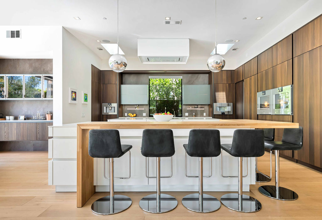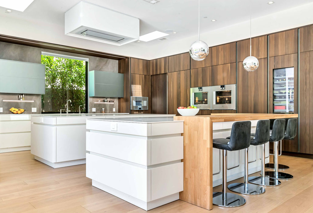 With two wide kitchen islands, there is plenty of workspace. Cooking and living take place simultaneously with ease. The careful choice of color and material beautifully complements the home's open-plan layout, enhancing the beauty and aesthetic of the home. This California modern kitchen adds an extra layer of sophistication and functionality, making this kitchen a perfect blend of elegance and practicality.