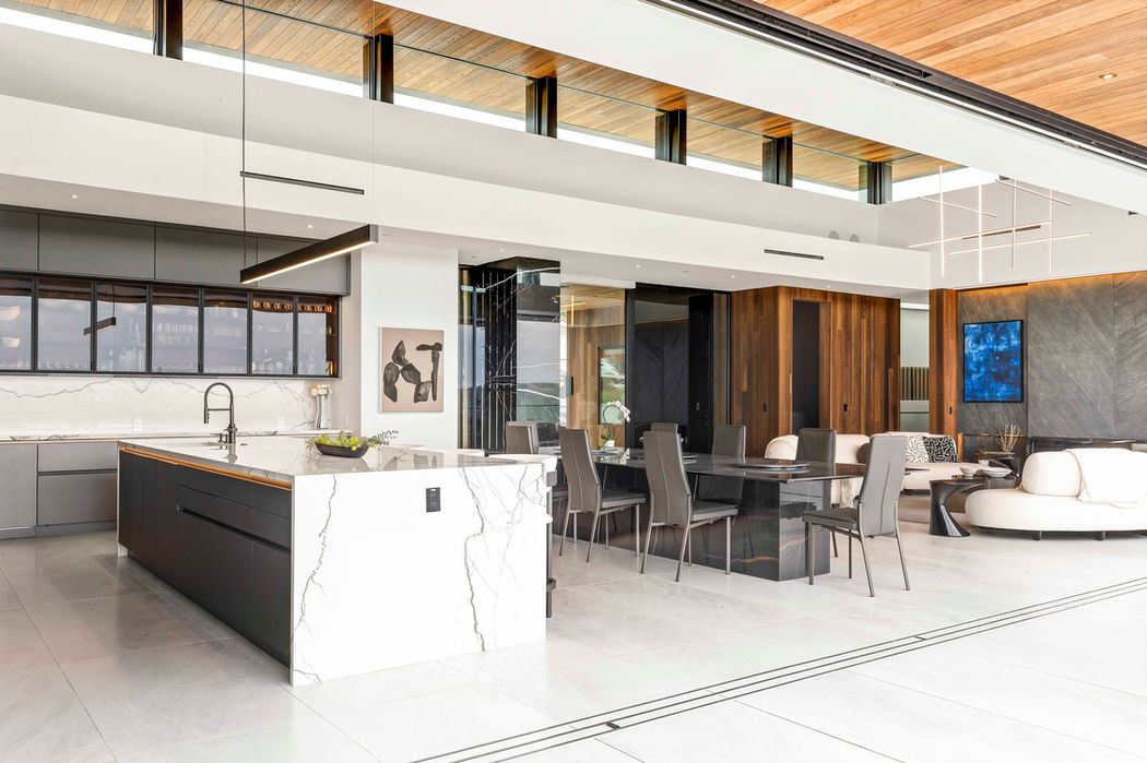 The dark matte cabinetry creates a dramatic backdrop, enhanced by full-height storage walls and built-in appliances. A waterfall island in white marble-look stone steals the spotlight, offering both workspace and seating in a seamless, sculptural form.